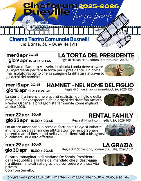 Qui a fianco la terza parte del Cineforum, per tutto il mese di aprile 2026.